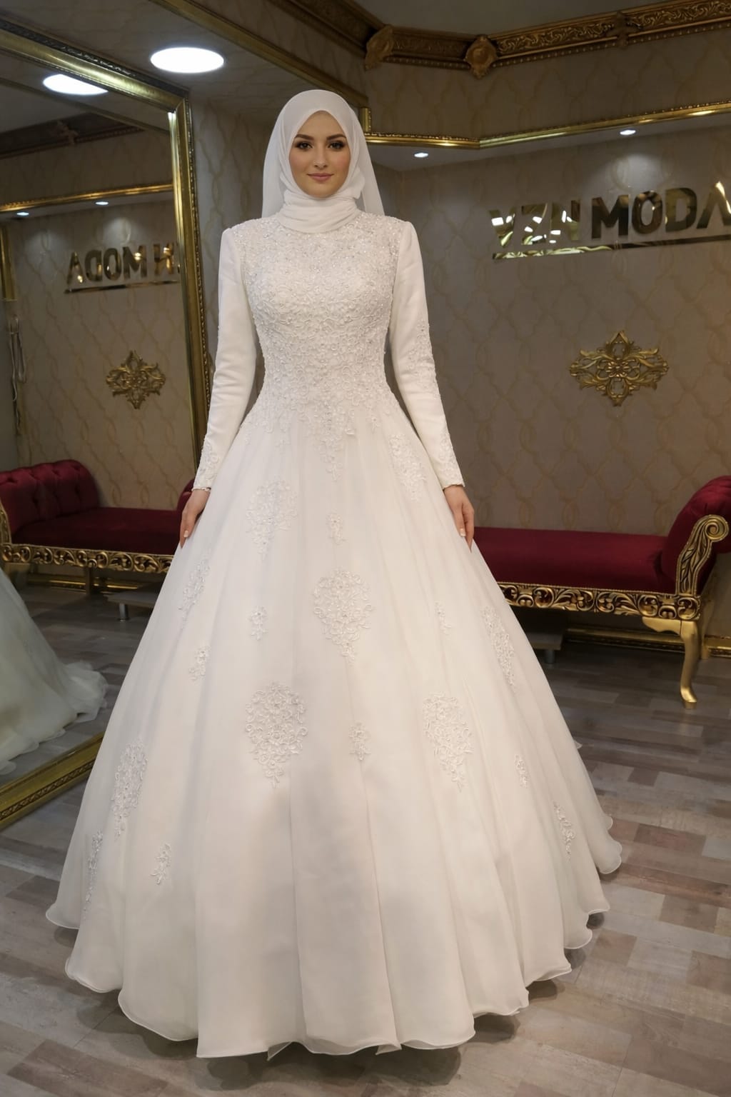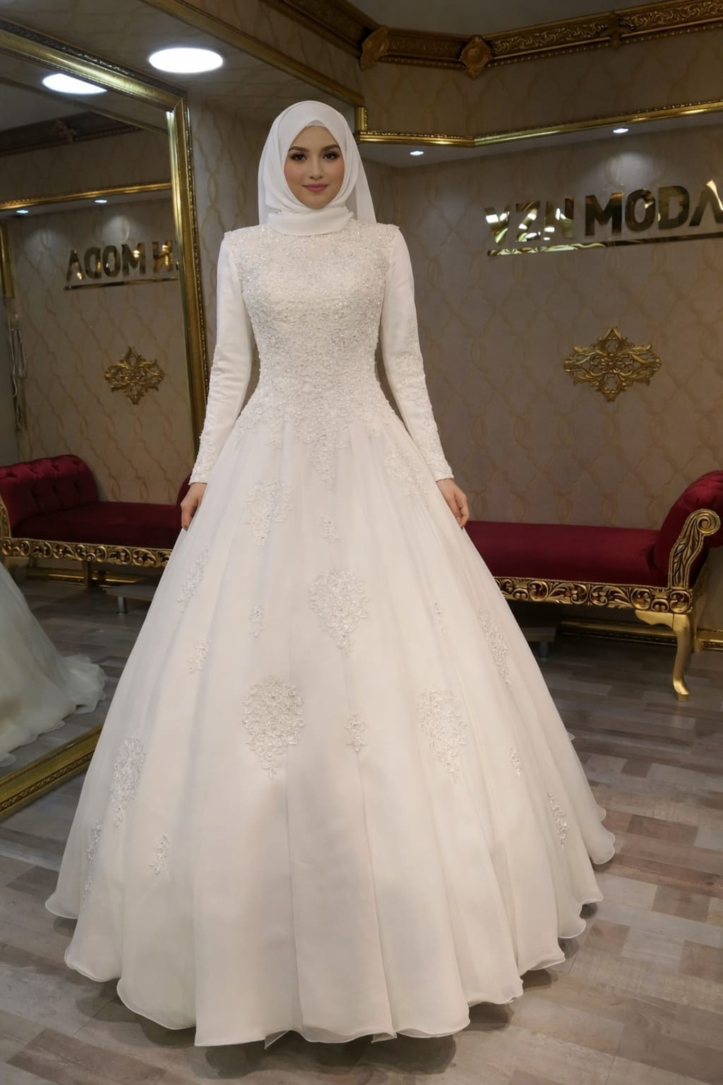 Ayşen Model Saten İşlemeli Tesettür Gelinlik