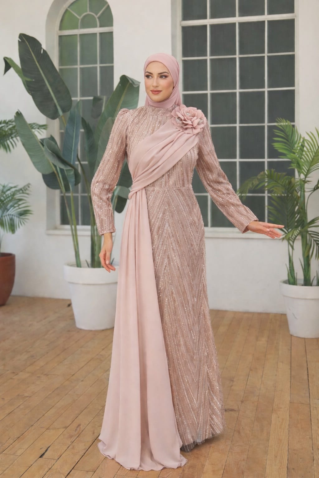 Aslında pudra pembesi, saflığın ve modern şıklığın en güçlü sembollerinden biridir; dolayısıyla bu modelle hem modası geçmeyecek hem de etkileyici bir duruş sergileyebilirsiniz. Çünkü VZN Moda, her detayı özenle hazırlanan bu tasarımla, tesettürlü kadınlara hayallerindeki o “aydınlık ve sofistike” görünümü sunmayı hedefler. Sonuç olarak, detaylardaki ustalığı teninizde hissetmek ve Alya modelin büyüleyici atmosferiyle fark yaratmak istiyorsanız, bu tasarım koleksiyonumuzun en nadide parçalarındandır. vznmoda.com/abiye