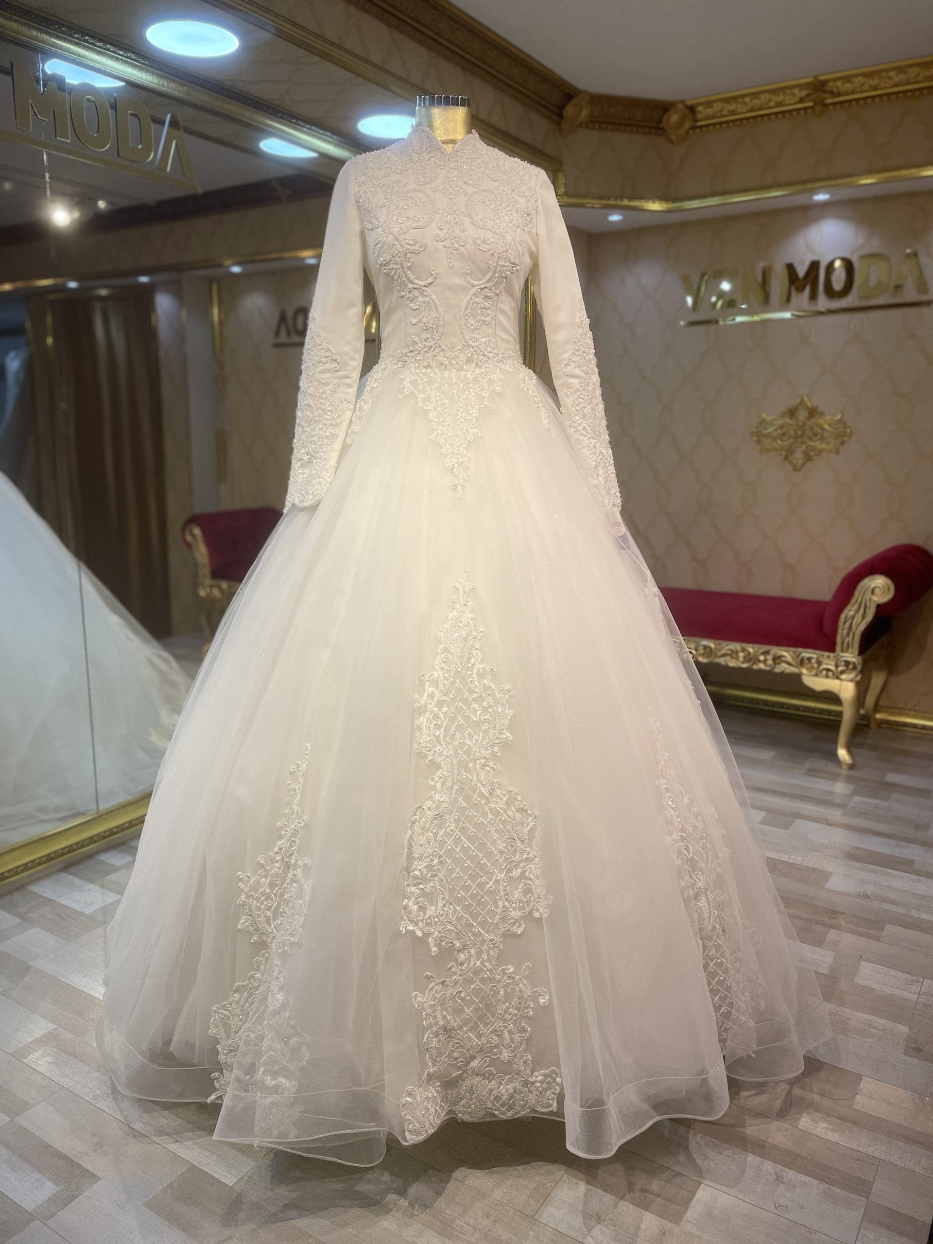 Beste Model Tesettür Gelinlik ile tanışın! Simli kumaş, A kesim dantelli tasarım ve 38-42 beden uyumlu yapısıyla şimdi indirimli fiyatlarla Vzn Moda’da.