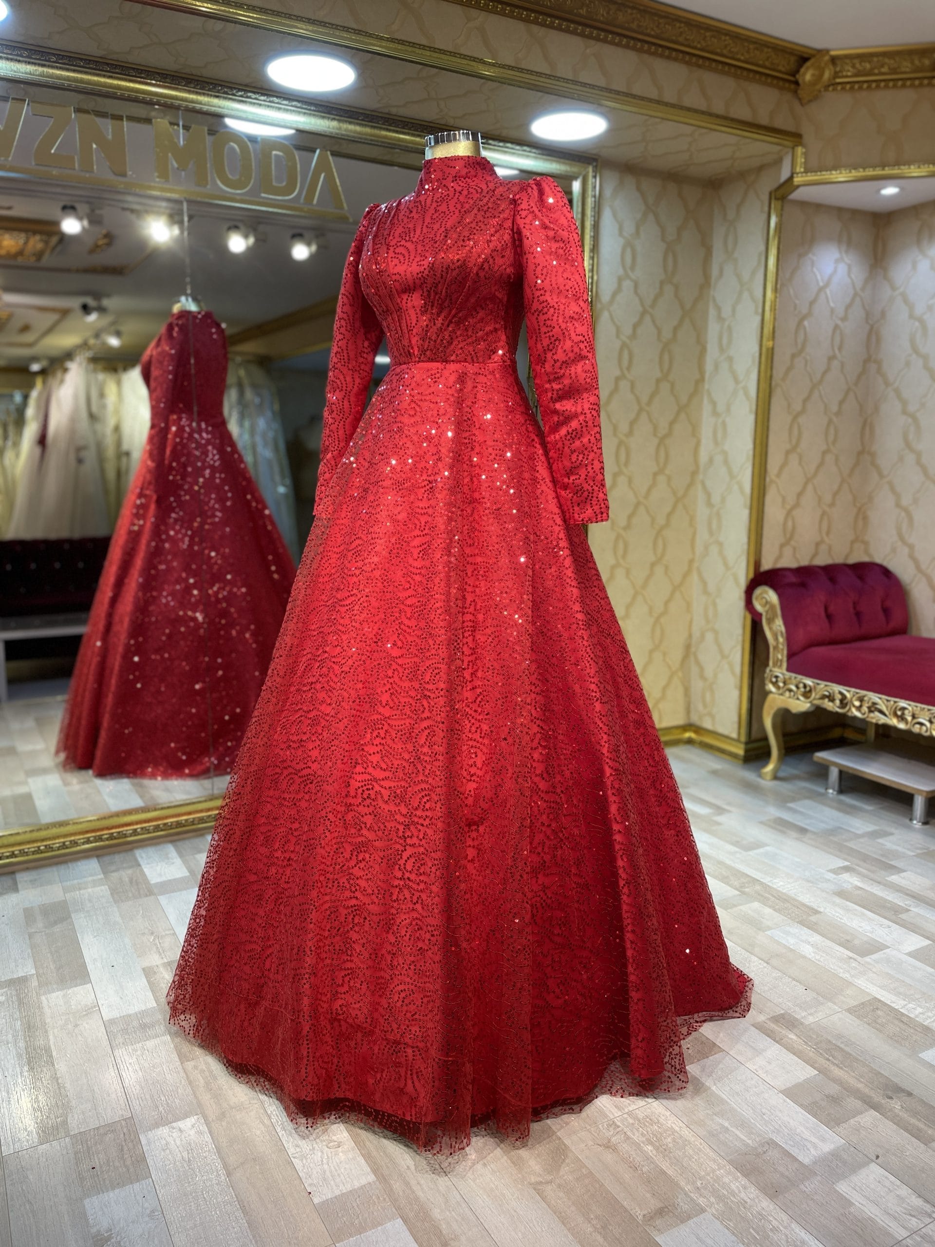 Tesettür, Payetli Dantel Kumaş, Helen kesim, Kırmızı Renk, Nişanlık, Kınalık,