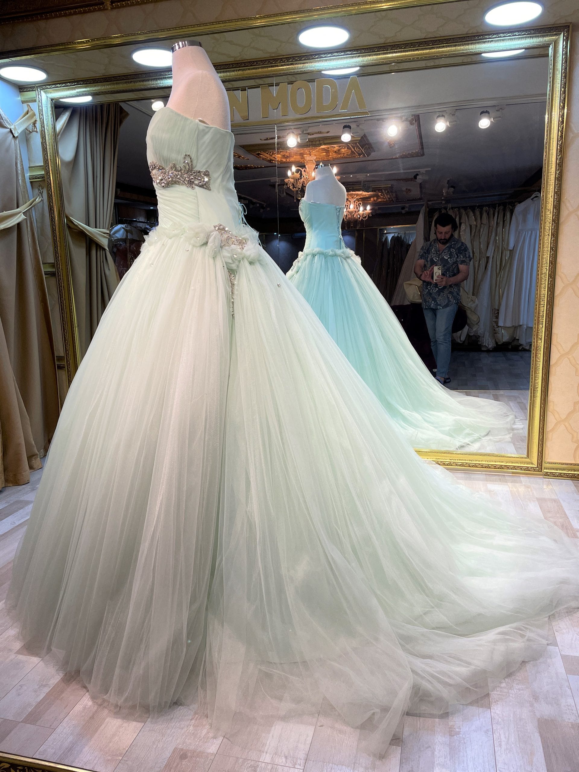 Destan su yeşili prenses nişanlık ile ihtişamı keşfedin! Kabarık etek tasarımı ve ferah rengiyle nişanınızın en şıkı olun. VZN Moda kalitesiyle.