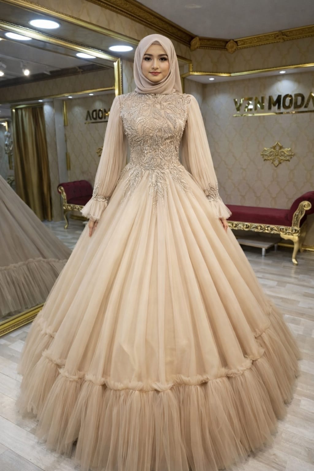 Esma vizon tesettür nişanlık ile zarafeti indirimli yakalayın! Hayal tül ve dantel detaylı A-kesim tasarımıyla VZN Moda’da fırsatı kaçırmayın.