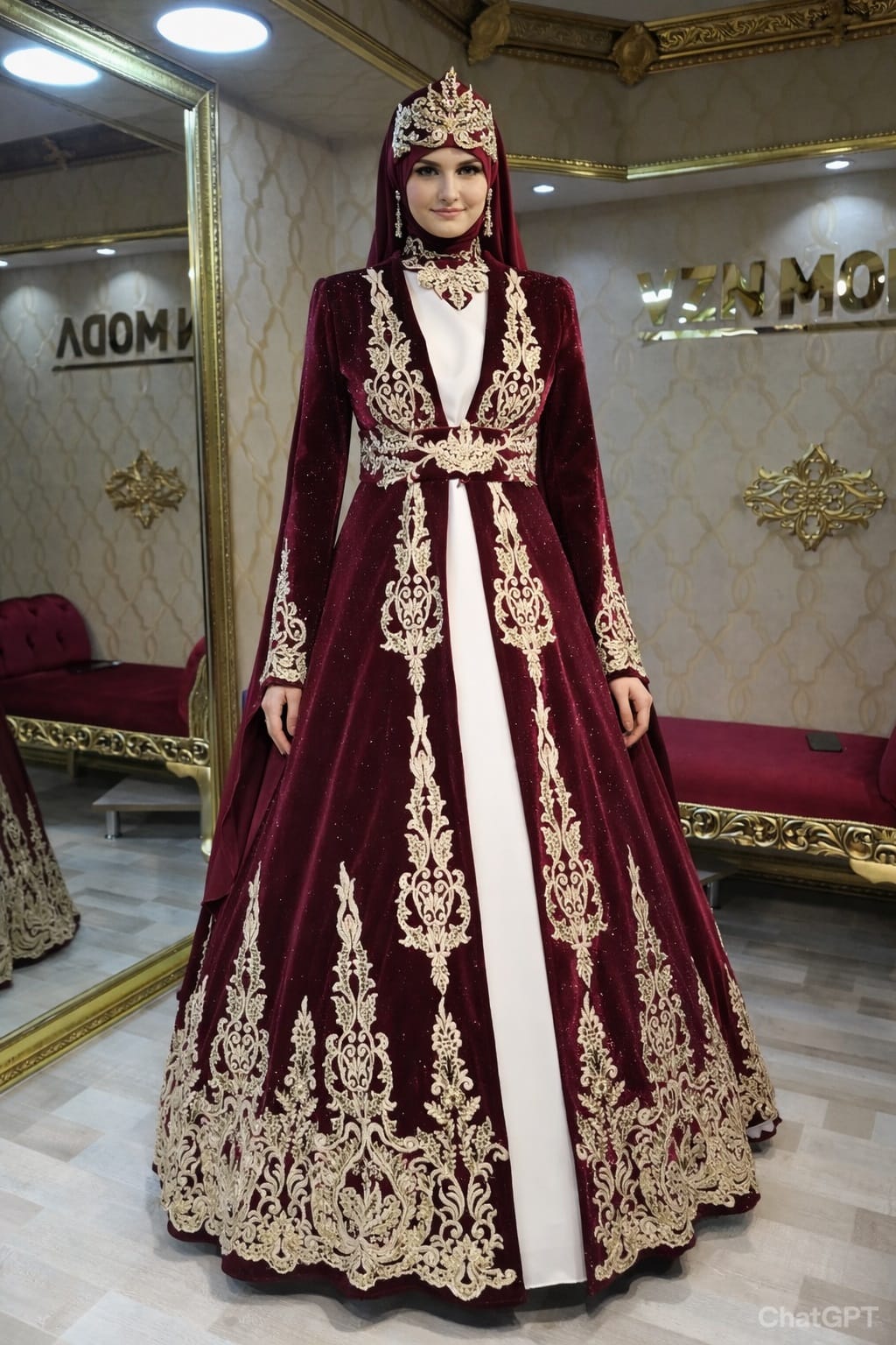 Aksesuar: Kaftanın üzerindeki altın işlemelerle uyumlu, kristal taşlı yüksek bir altın sultan tacı kullanarak görkemli duruşunuzu pekiştirebilirsiniz.