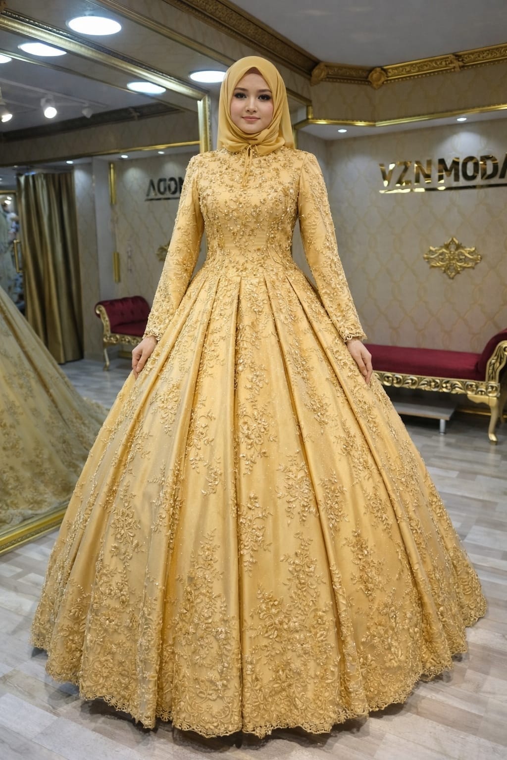 Hasibe Model’in en büyüleyici noktası, elbisenin geneline yayılan ve ışığı her açıyla yansıtan gold dantel aplikleridir. Buna ek olarak, vücut hatlarını zarifçe dengeleyen ve boyu daha uzun gösteren özel A-kesim formuyla dikkat çekmektedir. Özellikle hakim yaka tasarımı ve omuzlardan süzülen işlemeler, muhafazakar şıklığın en görkemli halini sunar. Üstelik kullanılan birinci sınıf kumaş ve titiz dikiş teknikleri, gece boyunca formunuzu koruyarak size konforlu bir şıklık vadeder. youtube.com/@vznmoda