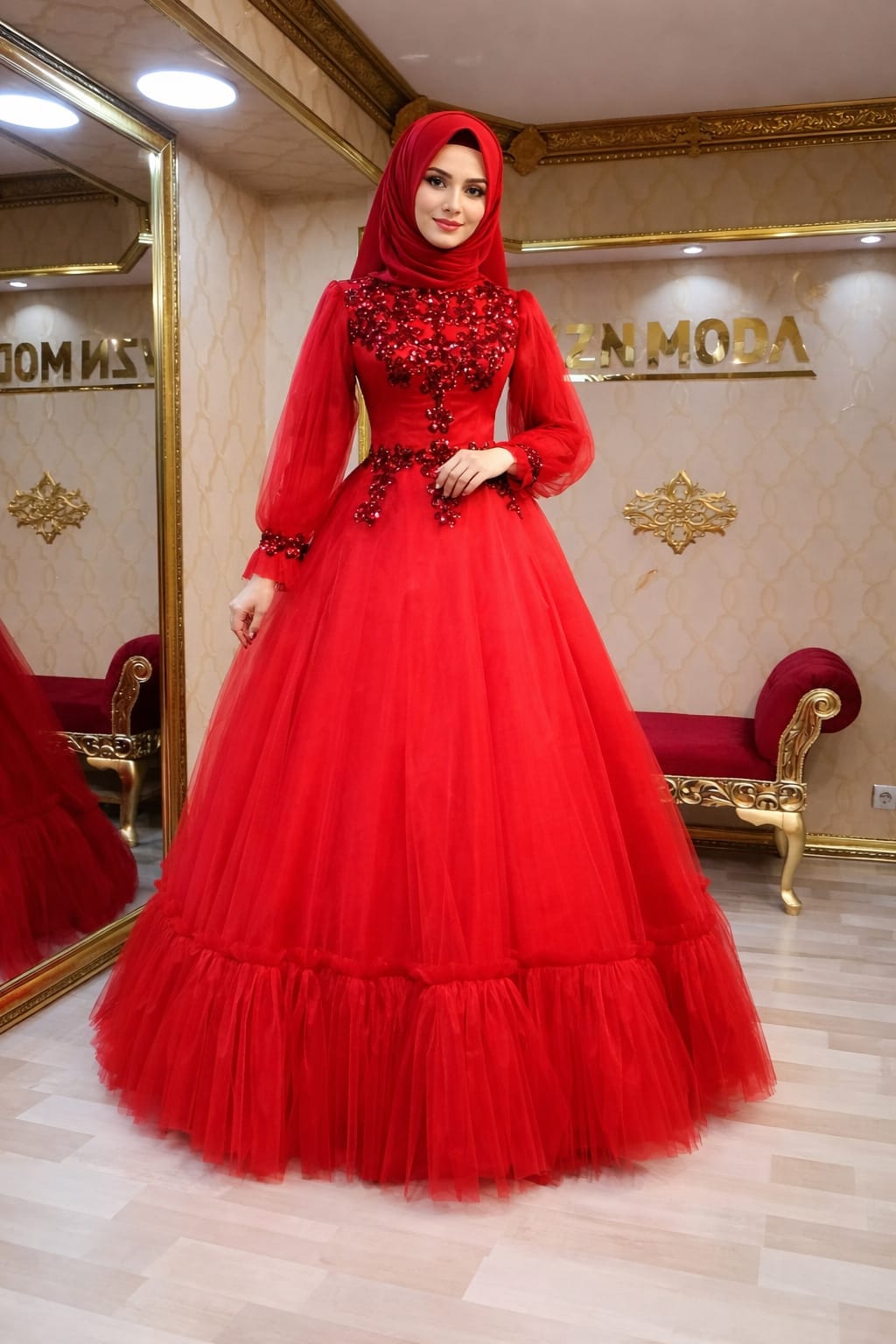 Mahide Model Kırmızı Tesettür Nişanlık Kınalık
