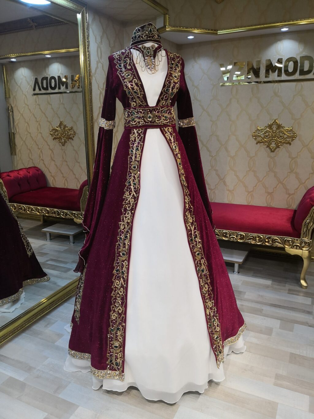 Tasarım: Yoğun sırma nakışlı, geleneksel saray stili motifler.